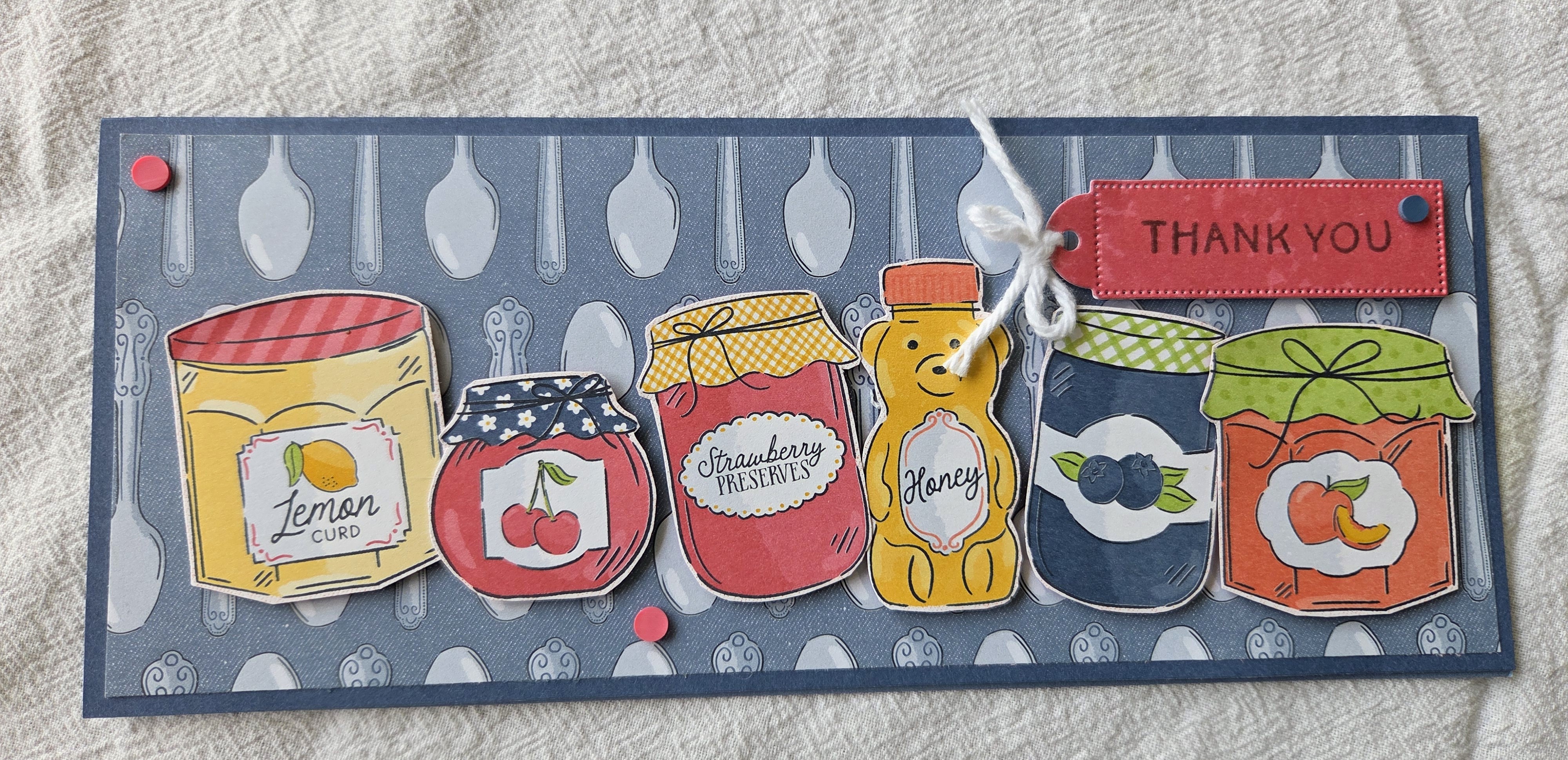 This card may look difficult to make, but it is actually very easy to create. The main technique I used is called “fussy cutting”. One of the papers in the designer series paper, Homemade Sweetness Suite has images of all sorts of jelly jars and honey in a repeating pattern. I cut around each of these six jars with my scissors staying very close to the image, but leaving a small white border around each one. I also used the Stampin’ Up! dimensional stickers to make the images stand up from the paper. The card base is made from the Made with Sweetness two toned cardstock. It is a slimline card with dimensions of 7 inches by 8 1/2 inches and then scored and folded at 3 1/2 inches on the 7 inch side. This creates the ability to mail this card in a normal mailing envelope. I layered the card by adding a designer paper with spoons on it, added my jars on the card with the dimensional stickers. I die cut the label out of the red patterned paper from the kit using the Filled with Sweetness dies (included in the suite) and stamped the sentiment on it with the Filled with Sweetness stamps (included in the suite). Finally, I added some embellishments from the Strawberries and Dots collection (included in the suite) and tied a white bow through the hole on the die cut. All items are available on my Stampin’ Up! website.